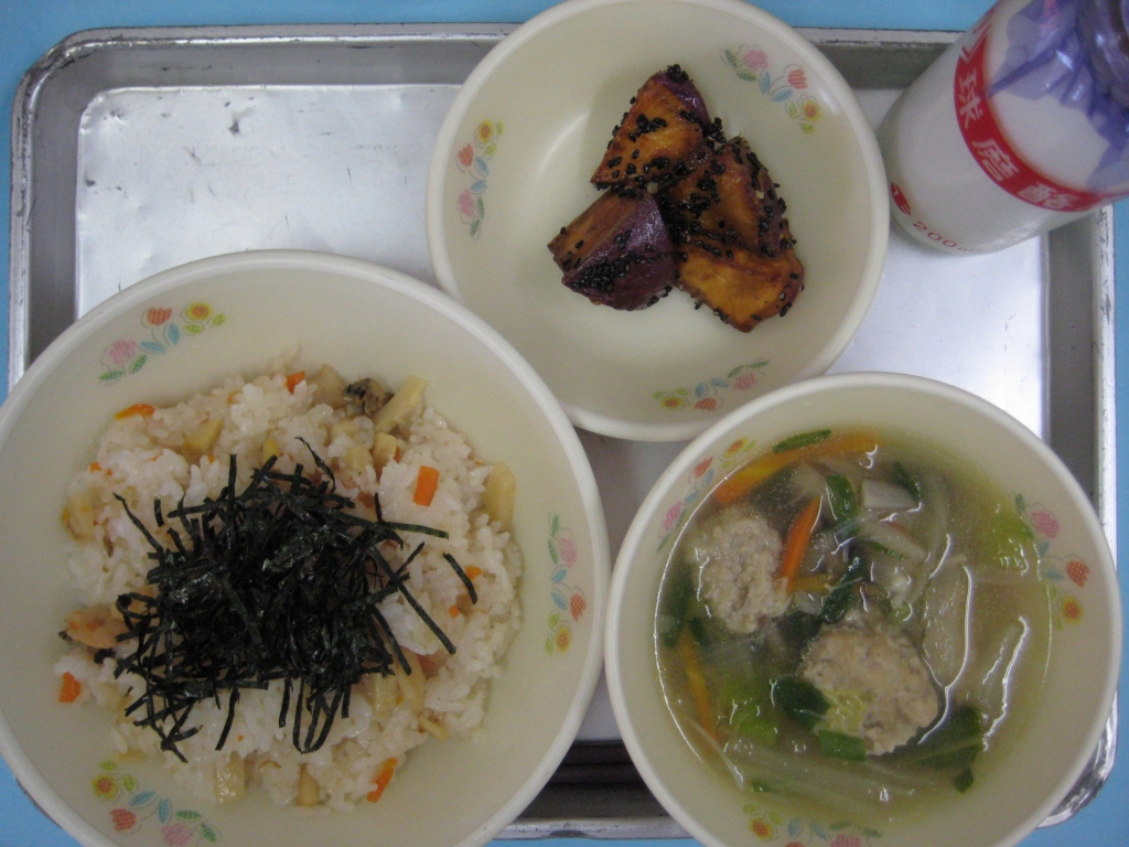 2013年11月22日 投稿日時 : 2013/11/22 ei/ho ☆ 海鮮おこわ ☆ れんこん入り肉団子スープ ☆ 大学芋 海鮮おこわは、いか・えび・あさりなどの魚介類をたくさん使っています。上にのせたきざみのりの風味とも合い、うま味のきいたおこわになりました。