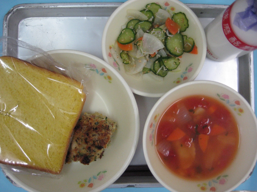 2013年9月11日 投稿日時 : 2013/09/11 ei/ho ☆ まるパン ☆ 野菜スープ ☆ 白身魚フライ ☆ オーロラサラダ 今日は、パンに白身魚フライとサラダをはさんで食べる「セルフバーガー」です。ハンバーガーなどを食べるときは、野菜サラダや野菜スープなどを付け合わせにして、野菜が不足しないようにしましょう。