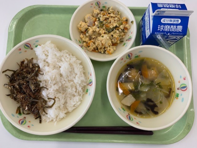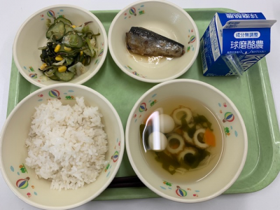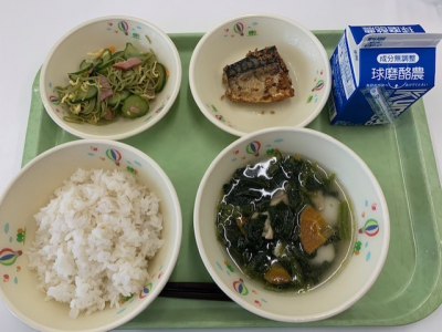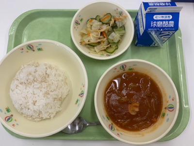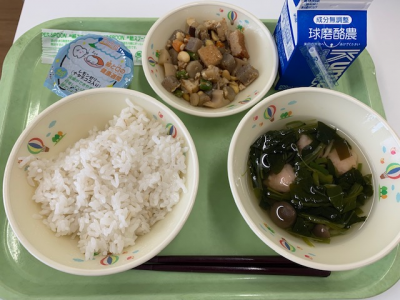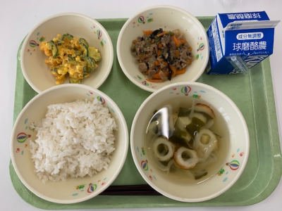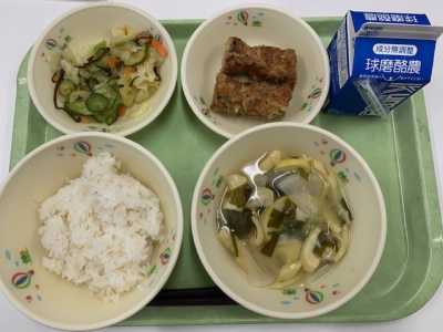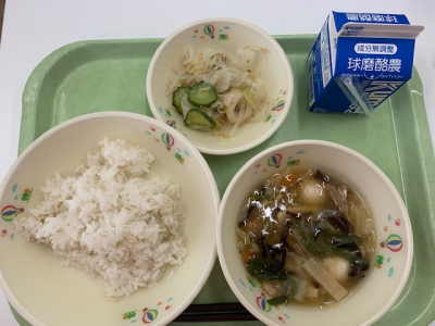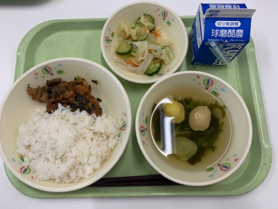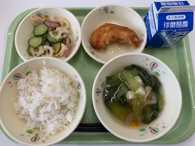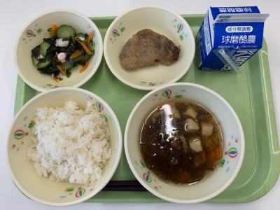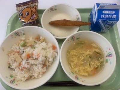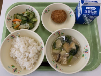 麦ごはん、牛乳、つぼん汁、えびフライ、奥球磨巻きでした。