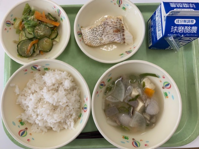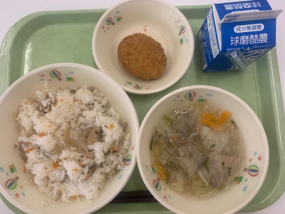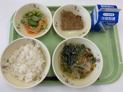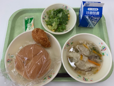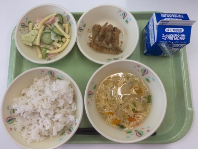 麦ご飯、牛乳、ワンタンスープ、松風焼き、中華サラダでした。