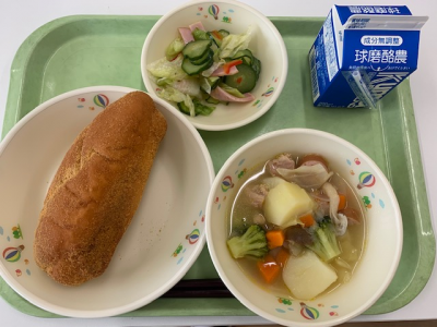 バーガーパン、牛乳、ミネストローネ、鮭のチーズフライ、グリーンサラダでした。