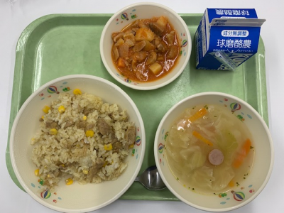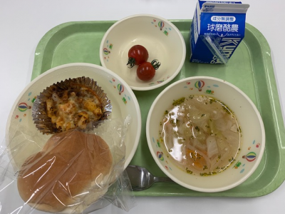 チキンライス、牛乳、ウインナーと野菜のスープ、オムレツでした。