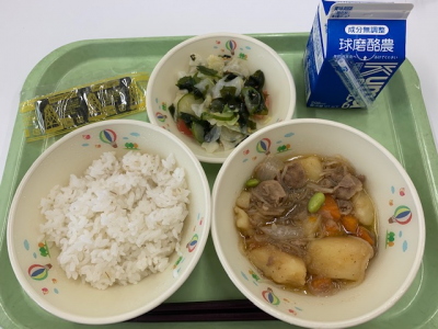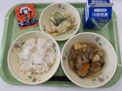 麦ご飯、牛乳、筑前煮、キャベツのごまあえでした。