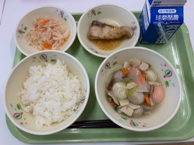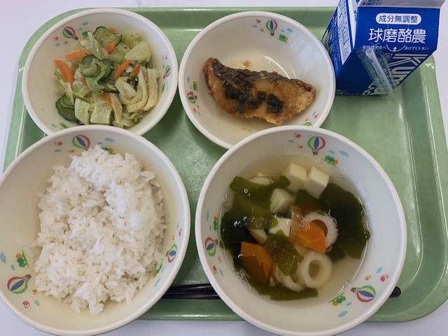 麦ごはん、牛乳、すまし汁、ちくわの二色揚げ、冬野菜の甘酢漬けでした。