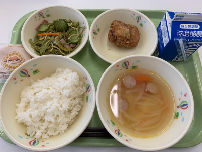 麦ごはん、牛乳、カリカリチキンのねぎソース、五目スープ、カラフルサラダでした。