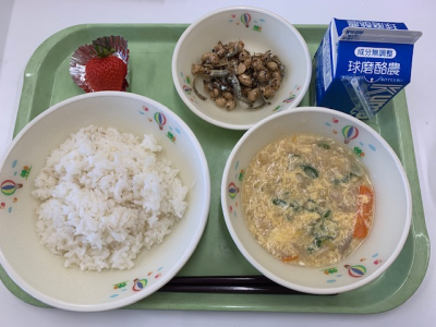 麦ごはん、牛乳、かきたま汁、大根と豚肉のみそ煮、味付けのりでした。