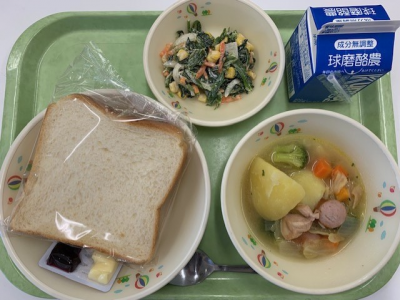 セサミトースト、牛乳、根菜ポトフスープ、大豆とツナのサラダでした。