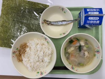 麦ごはん、牛乳、白菜のみそ汁、いわしのしょうが煮、手作りふりかけ、黒棒でした。