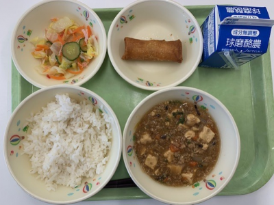 麦ごはん、牛乳、ハヤシの具、フレンチサラダ、(中学生のみ)奥球磨巻きでした。