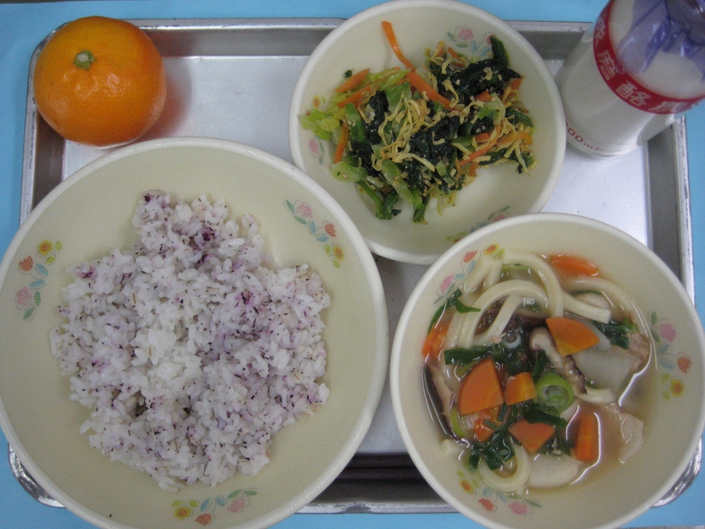 2013年12月13日 投稿日時 : 2013/12/13 ei/ho ☆ ゆかりご飯 ☆ しっぽくうどん ☆ 千草和え ☆ みかん 今日は、午後からお隣の湯前中学校で持久走大会があるとのことだったので、消化が良く、エネルギーになりやすいメニューにしました。