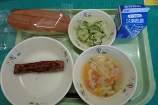 今日の給食 投稿日時 : 2018/10/03 ei/ho ★ミルクパン★タンドリーチキン★梅ドレッシングサラダ★野菜スープ先週の土曜日はお弁当でしたが、どれもおいしそうで、みんな笑顔で食べていました。昨日運動会でしたので、今日は久しぶりの給食です。梅ぼしが苦手で、苦労している人もいましたが、時間内に食べた人が多く、残食はパン一口でした。タンドリーチキンがとても人気でした。運動会のあとで、疲れている人もいますが、しっかり食べて、今週のこり2日元気に過ごしてほしいです。
