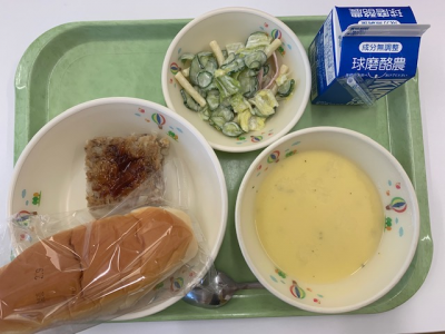 黒糖パン、牛乳、白菜と肉団子のスープ、コロコロポテトサラダでした。