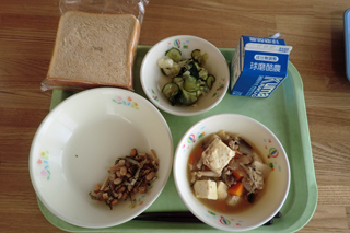 今日の給食 投稿日時 : 2017/06/06 ei/ho ★黒糖パン★牛乳★肉豆腐★いりことナッツのみるくあえ★わかめの酢の物歯と口の健康週間に2日目です。今日はいりことナッツのかみかみ献立です。給食の放送のときもよくかんで食べるよう話をしました。一口で何回かんで食べていますか?数えてみてください。