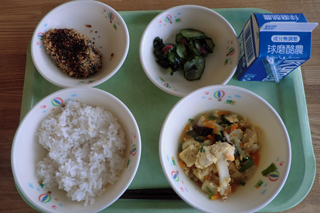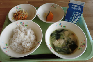 今日の給食 投稿日時 : 2017/06/22 ei/ho ★麦ごはん★牛乳★カレーコロッケ★ぶたしゃぶごまあえ★かぼちゃ団子汁今日は、かぼちゃを使った団子汁です。かぼちゃは、夏野菜のひとつです。夏野菜がおいしい季節になりました。苦手な人が多い夏野菜です。いろいろな料理に入れて、少しでも多く食べてほしいです。今日の団子はやわらかく、子どもたちもおいしいといってくれました。