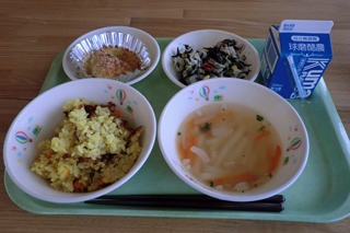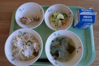 今日の給食 投稿日時 : 2017/06/15 ei/ho ★こぎつねごはん★牛乳★てばもとのさっぱり煮★ズッキーニのあっさりづけ★たまねぎの味噌汁 子どもたちから、「なんでこぎつねなんですか?」と質問がありました。「きつねがつく料理は何?」と質問したら、「油揚げ」と答えてくれました。小さく切った油揚げが入っているので、こぎつねごはんとつけました。いなりずしのようなごはんです。今日のごはんも完食でした。