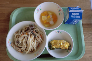 今日の給食 投稿日時 : 2017/06/20 ei/ho ★焼きうどん★牛乳★ツナチーピーマン★フルーツしらたま今日は、麺を主食にした給食でした。初めてのことだったようで、戸惑っていましたが、きちんと配膳していました。ピーマンを少しでも好きになってほしいと思い、ツナチーピーマンを出しました。ピーマンだとがっかりしていた人もいましたが、残食はゼロ。具と一緒に食べたら、食べられましたと話をしてくれました。手作りで大変なので、なかなかできませんが、料理の仕方で食べることができるということを実感してほしいと思っています。