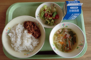 今日の給食 投稿日時 : 2017/06/02 ei/ho ★麦ごはん★牛乳★じゃがいものそぼろ煮★トマトときゅうりのサラダ 今日はJAくまよりトマトをいただきました。今日は、トマトたっぷりのサラダにしました。おいしいトマトでした。旬のトマトを食べると病気をしないので、たくさん食べてほしいです。