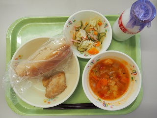 今日の給食 投稿日時 : 2016/06/15 ei/ho ★米粉パン★牛にゅう★やきそば★ささみときゅうりのサラダ★ミニトマト今日は、ミニトマトでした。ふつうの大きなトマトよりもミニトマトの方が栄養多く含まれています。苦手な人もしっかり食べることができたでしょうか?