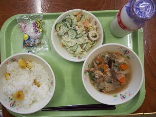 今日の給食 投稿日時 : 2016/09/15 ei/ho ★栗ごはん★牛にゅう★のっぺい汁★ごまネーズ和え★お月見団子今日は、中秋の名月ということで「十五夜メニュー」でした。十五夜は、1年で最も美しい満月である日です。また、秋の収穫に感謝をする日でもあります。今日は、球磨郡でとれた栗をつかった「くりごはん」と秋が旬のさといもやしいたけをつかった「のっぺい汁」でした。秋には、おいしい食べ物がたくさん収穫されます。しっかりと感謝をしていただきたいですね。