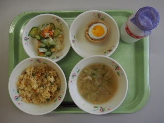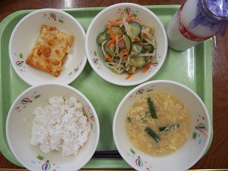 今日の給食 投稿日時 : 2016/07/11 ei/ho ★ミルクパン★牛にゅう★冷やしちゅうか★ゴーヤチャンプルー★冷凍みかん今日は、夏の暑さから体を守ってくれる食材を使ったメニューでした。ゴーヤは、苦手な人でも食べられるようにと、うすくスライスして、じっくりと炒めたので、苦手な人でも食べられていたようでよかったです!(ゴーヤが好きな人には、少し物足りなかったでしょうか。。。)ゴーヤには、ビタミンなどがたくさん含まれているので、夏の暑さから体を守ってくれるはたらきがありますよ♪