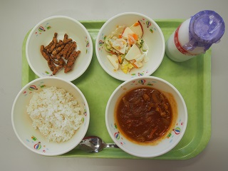 今日の給食 投稿日時 : 2016/09/01 ei/ho ★チキンカレー(むぎごはん)★牛にゅう★福神漬け★ひじきとツナのサラダ 今日から2学期が始まりました。みなさん夏休みはどうでしたか? 夏休みにだらだらとすごしてしまい、夏バテになってしまったという人はいませんか? 今日は、チキンカレーでした。カレーに使われているスパイスの中には、食欲を増進する効果があるものもあります。 2学期は、運動会などいろいろな行事があります。しっかり食べて力をつけていきましょう♪