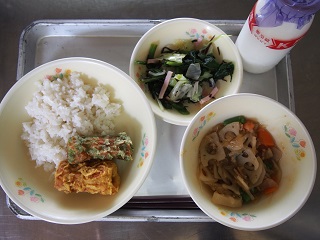 今日の給食 投稿日時 : 2015/12/21 ei/ho ★麦ごはん★牛にゅう★れんこんの春雨丼★ちくわの二色あげ★ほうれん草サラダ今日は、熊本県内の特産品や郷土料理について紹介する「ふるさとくまさんデー」でした。今日は、「れんこん」の紹介でした。れんこんは、ちょうど今が旬の食べ物で、穴が開いていることから”先が見える”、”見通しがきく”とえんぎの良い食べ物とされていて、正月のおせち料理にも使われます。そんな「れんこん」を今回は、春雨と一緒に炒めて、れんこんの春雨丼にしました。とてもごはんに良く合う一品でしたね♪