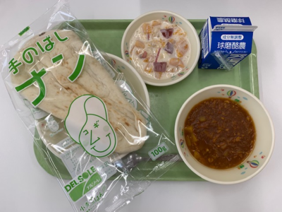 ナン、牛乳、キーマカレー、フルーツヨーグルトでした。