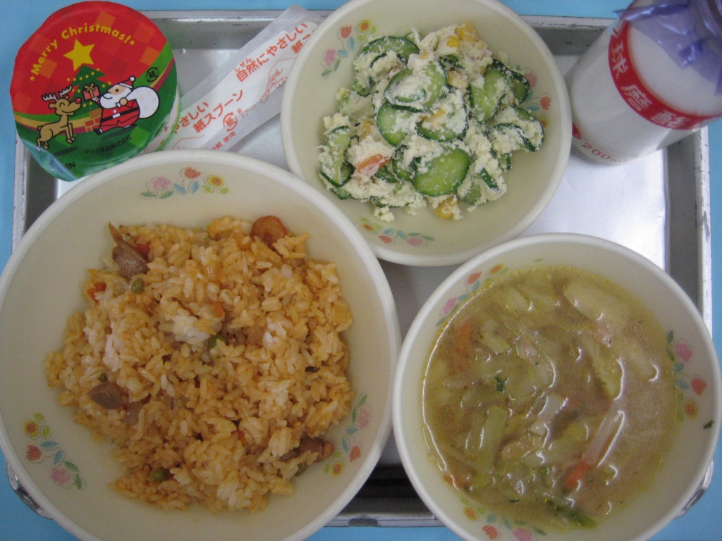 2013年12月24日 投稿日時 : 2013/12/24 ei/ho ☆ チキンライス ☆ 野菜とベーコンのスープ ☆ うのはなサラダ ☆ セレクトデザート 今日は2学期最後の給食でした!セレクトデザートは5種類で、「ホワイトケーキ」「チョコレートケーキ」「スフレチーズケーキ」「チョコレートムース」「ホワイトチョコムース」の中から一つ選びました。