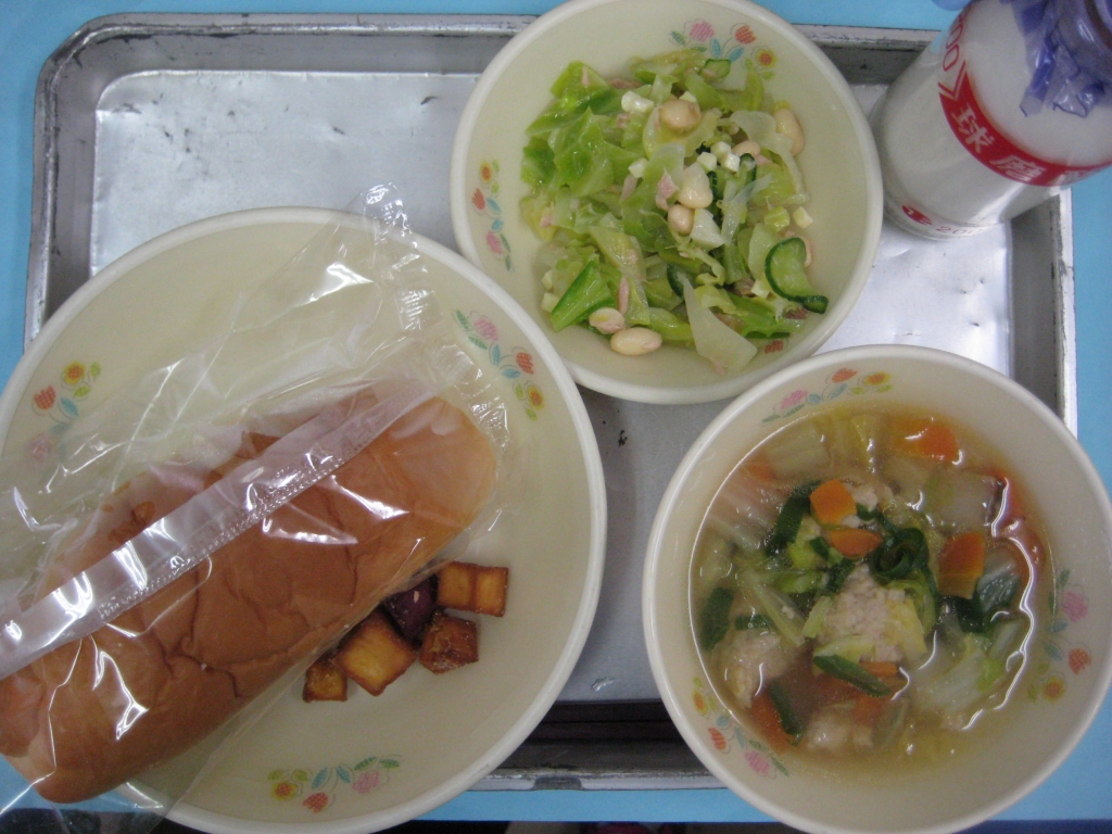 2013年12月16日 投稿日時 : 2013/12/16 ei/ho ☆ ミルクパン ☆ 白菜と肉団子のスープ ☆ 大豆とツナのサラダ ☆ キャラメルポテト 「キャラメルポテト」は、角切りにしたさつまいもを油で揚げ、バターとグラニュー糖をからめた料理です。バターの風味とさつまいもがよく合う一品です。