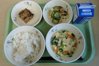 今日は中華料理です。今日の献立は人気のようで、いつもよりたくさんの人においしかったですと言ってもらえました。味のバランスがよかったようです。ただ、体調が悪く、給食を残した人もいました。体調管理には気を付けたいものです。