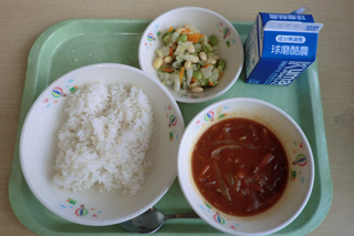 今日は手作り肉団子のスープです。調理室に入ったら、肉団子のおいしいにおいがしました。味も、手作り肉団子でないと出せない味です。子どもたちもおいしいといって食べていました。