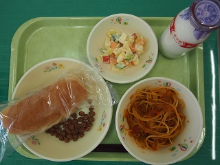 今日の給食 投稿日時 : 2017/03/08 ei/ho ★げんまいパン★牛にゅう★スパゲティミートソース★マセドアンサラダ★ココア豆今日は、マセドアンサラダでした。マセドアンとは、フランス語でさいの目切りのことを言います。ということで今日は、りんごやきゅうりなどがコロコロした形に切られていました。いつもとは、違う食感でしたね♪