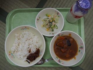 今日の給食 投稿日時 : 2016/09/01 ei/ho ★チキンカレー(むぎごはん)★牛にゅう★福神漬け★ひじきとツナのサラダ 今日から2学期が始まりました。みなさん夏休みはどうでしたか? 夏休みにだらだらとすごしてしまい、夏バテになってしまったという人はいませんか? 今日は、チキンカレーでした。カレーに使われているスパイスの中には、食欲を増進する効果があるものもあります。 2学期は、運動会などいろいろな行事があります。しっかり食べて力をつけていきましょう♪