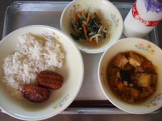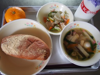今日の給食 投稿日時 : 2015/11/12 ei/ho ★ひじきごはん★牛乳★豆腐の五目スープ★大学芋★菜果なます今日は、菜果なますでした。熊本県鹿北町でお祭りの時などによく作られる料理だそうです。野菜と果物が入ったなますなので「菜果(さいか)なます」といいます。また今日は、大学芋でした。調理場には、約25kgのさつまいもが届き、調理員さんが一生懸命調理してくださいましたよ。一度油で揚げてあるさつまいもは、かみ応えがあったと思いますが、みなさんよくかんで食べることができたでしょうか?