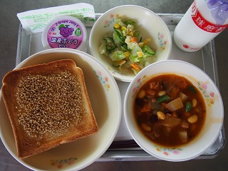 今日の給食 投稿日時 : 2015/09/10 ei/ho ★セサミトースト★牛乳★ポークビーンズ★ツナサラダ★ぶどうゼリー今日は、セサミトーストでした。調理場で一つ一つトーストしましたよ。みなさんどうだったでしょいか?ごまには、セサミンとよばれる栄養素が入っています。セサミンには、生活習慣病やガンを予防する効果があります。昔ながらの日本料理にもよく使われる「ごま」は、栄養満点の食べ物です。