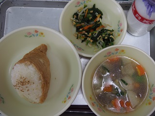 今日の給食 投稿日時 : 2015/09/17 ei/ho ★ジャンボいなり★牛乳★けんちん汁★アーモンド和え今日は、ジャンボいなりでした。調理員さんたちは、油あげをやぶらないように、酢めしをつめる作業をがんばっておられました!!みなさん、どうだったでしょうか?今日のジャンボいなりは三角形をしていましたが、四角い形をしていたり、具ににんじんやしいたけが入っているいなりずしもあるそうです。同じいなりずしでもいろいろな種類があって興味深いですね。