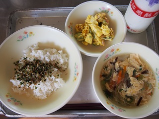 今日の給食 投稿日時 : 2015/09/25 ei/ho ★麦ごはん★牛乳★かきたま汁★手作りふりかけ★なかよしサラダ今日は、これから旬をむかえるかぼちゃとじゃがいもとたまねぎやきゅうり、りんごやチーズ、ハムなどを和えた「なかよしサラダ」でした。ちなみにチーズやハムには、成長期には欠かすことのできないタンパク質が多く含まれていますよ。