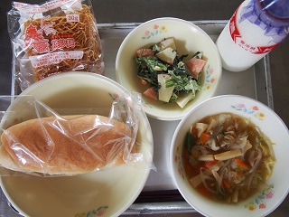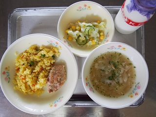 今日の給食 投稿日時 : 2015/06/22 admin ☆キムタクごはん ☆牛乳 ☆汁ビーフン ☆いわしのカリカリフライ ☆ブロッコリーのおかか和え 今日はキムタクごはんでした。キムタクごはんとは、キムチとたくあんを混ぜ合わせたごはんです。日本の漬け物であるたくあんと、韓国の伝統的な漬け物キムチの共演はどうだったでしょうか? いろんな国の伝統料理を調べてみるのもいいですね。