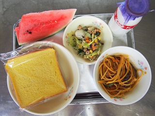 今日の給食 投稿日時 : 2015/07/13 ei/ho ★かぼちゃパン★牛乳★夏野菜スパゲティ★コブサラダ★すいか今日は夏が旬の食べ物をたくさん使った献立でした。かぼちゃ、トマト、ピーマン、なす、きゅうり、すいかどれも夏にぜひ味わってほしい食べ物ばかりです。また、今日の和え物であるコブサラダ。みなさんご存じでしょうか?コブサラダとは、今から約80年前にアメリカで生まれた料理で、あるレストランでコブさんという方がまかないとして作ったのがはじまりだそうです。料理にはいろいろな意味や由来があっておもしろいですね。