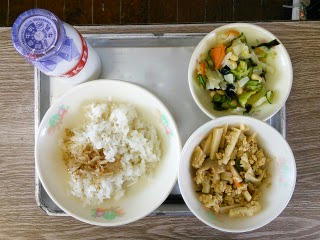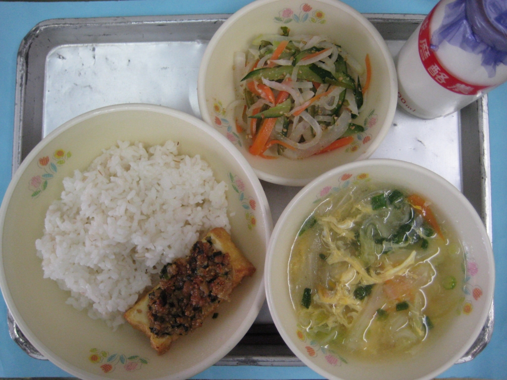 今日の給食 投稿日時 : 2015/05/26 tei ☆麦ご飯 ☆牛乳 ☆いりどうふ ☆たくあんのごまあえ☆大豆とわかめのサラダ 今日は、「畑の肉」とよばれる『大豆』を使った献立です。大豆には、血や肉になるタンパク質や骨や歯を作ってくれるカルシウム、かぜを予防してくれるビタミンなどが入っていて、栄養満点です。今日はそんな大豆と大豆からできたとうふを使った「いりどうふ」でした。