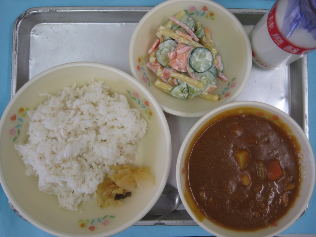 2014年3月7日 投稿日時 : 2014/03/07 ei/ho ☆ 麦ご飯 ☆ チキンカレー ☆ マカロニサラダ ☆ 福神漬け 今日は、人気ナンバー1のカレーライスです!実は、小学校と中学校のカレーは少し違っていて、中学校のカレーは少し辛めの味付けになっています。もうすぐ中学生になる6年生も、味の違いに気付いてくれると嬉しいです!