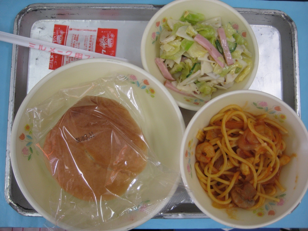 2014年3月12日 投稿日時 : 2014/03/14 ei/ho ☆ パインパン ☆ スパゲッティペスカトーレ ☆ れんこんのゴマドレ ☆ ミルメーク「ペスカトーレ」とは、イタリア語で、「漁師」という意味です。昔、漁師が売れ残った魚介類をトマトソースで煮込んで食べていたものが始まりとされています。学校では、たくさんのイカとえびを使いました。