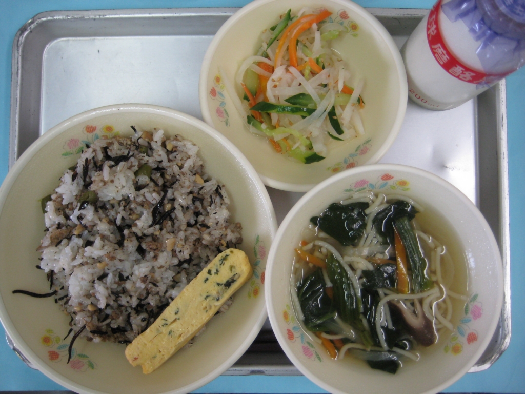 2014年3月13日 投稿日時 : 2014/03/14 ei/ho ☆ ひじきそぼろご飯 ☆ 魚そうめん汁 ☆ 千草焼き ☆ 三色なます ひじきそぼろご飯にはたくさんの「ひじき」と「大豆」を使っています。これらには、骨や歯をじょうぶにするカルシウムが豊富に含まれています。