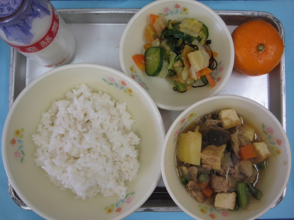 2014年3月17日 投稿日時 : 2014/03/17 ei/ho ☆ 麦ご飯 ☆ 肉じゃが ☆ 即席漬け ☆ みかん 「肉じゃが」は、明治時代にビーフシチューのレシピを元にして、日本海軍で作られたのが始まりだと言われています。当時の海軍では、ビタミン不足が原因で病に倒れる水兵が多く、深刻な問題になっていました。そこで、肉や野菜など様々な食材を使って作る栄養満点の「肉じゃが」が、それらの問題を解決してくれる料理として注目を集め、海軍の間に定着していきました。