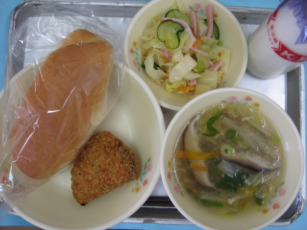2014年3月10日 投稿日時 : 2014/03/10 ei/ho ☆ パインパン ☆ 野菜とベーコンのスープ ☆ 魚のチーズフライ ☆ ドレッシングサラダ 「魚のチーズフライ」には、鮭を使っています。鮭は、栄養バランスのすぐれた魚で、体を作るもとになる働きをする「たんぱく質」はもちろん、生活習慣病を予防する効果のあるEPAやDHAなども豊富に含まれています。