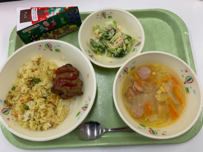 カレーピラフ、牛乳、ウインナーと野菜のスープ、ツリーハンバーグ、ブロッコリーサラダ、セレクトケーキでした。