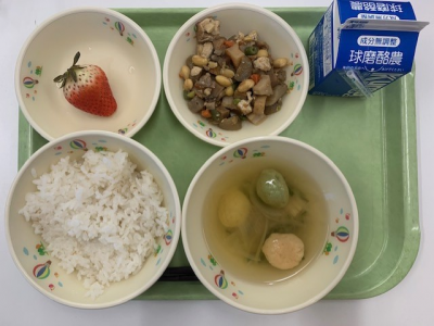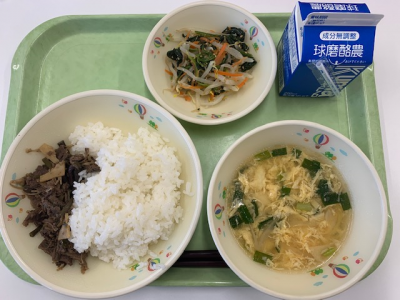 ひきにく入り菜めし、牛乳、すいとん、しのだ煮でした。