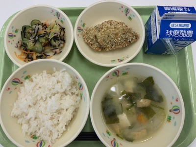 キムタクごはん、牛乳、あおさ汁、メンチカツでした。