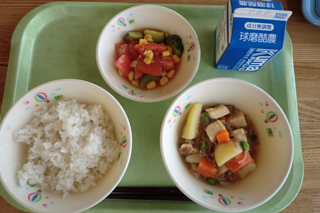 今日の給食 投稿日時 : 2017/06/02 ei/ho ★麦ごはん★牛乳★じゃがいものそぼろ煮★トマトときゅうりのサラダ 今日はJAくまよりトマトをいただきました。今日は、トマトたっぷりのサラダにしました。おいしいトマトでした。旬のトマトを食べると病気をしないので、たくさん食べてほしいです。