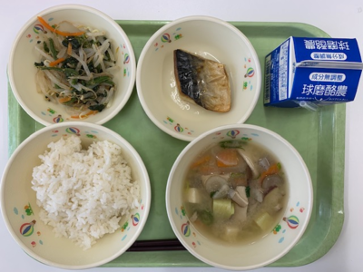 麦ご飯、牛乳、さばの塩焼き、さつま汁、ごまあえでした。